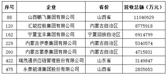 今年,共有7家民營煤炭企業(yè)上榜,分別為:山西鵬飛集團有限公司(第88位,營業(yè)收入11040629萬元)、匯能控股集團有限公司(第120位,營業(yè)收入8775918萬元)、寧夏寶豐集團有限公司(第162位,營業(yè)收入6914799萬元)、內(nèi)蒙古伊泰集團有限公司(第229位,營業(yè)收入5340574萬元)、內(nèi)蒙古蒙泰集團有限公司(第260位,營業(yè)收入4715831萬元)、瑞茂通供應鏈管理股份有限公司(第422位,營業(yè)收入3149847萬元)、永泰能源集團股份有限公司(第475位,營業(yè)收入2835653萬元)。其中,山西鵬飛集團有限公司、匯能控股集團有限公司、寧夏寶豐集團有限公司的營業(yè)收入較上年有所提升,其余4家企業(yè)營業(yè)收入出現(xiàn)下滑,去年上榜的美錦能源集團有限公司今年未上榜。