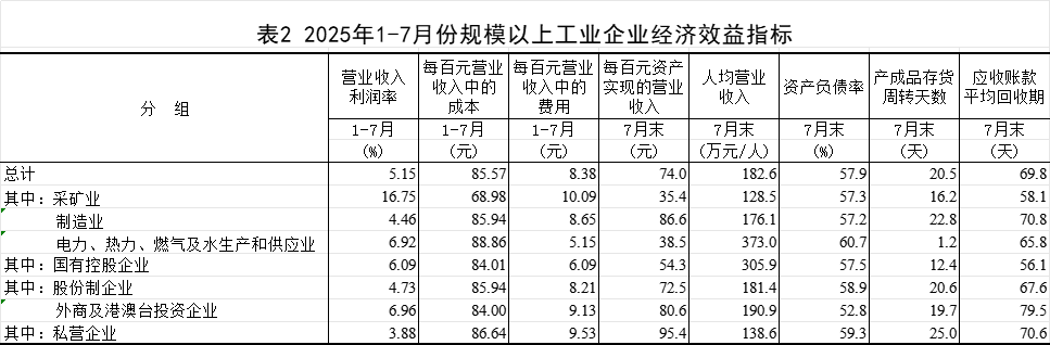 1—7月份,規(guī)模以上工業(yè)企業(yè)每百元營(yíng)業(yè)收入中的成本為85.57元,同比增加0.24元;每百元營(yíng)業(yè)收入中的費(fèi)用為8.38元,同比減少0.08元。