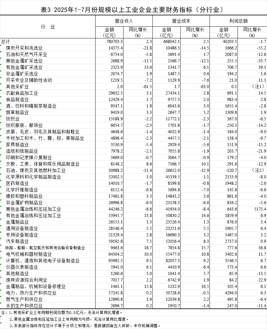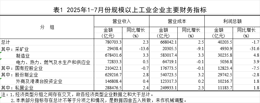 1—7月份,全國(guó)規(guī)模以上工業(yè)企業(yè)實(shí)現(xiàn)利潤(rùn)總額40203.5億元,同比下降1.7%(按可比口徑計(jì)算,詳見附注二)。